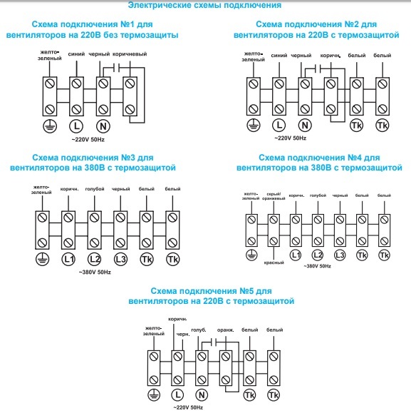 Для защиты от перегрева вентиляторы оснащены встроенными термоконтактами с выводами для подключения к устройству защиты двигателя.